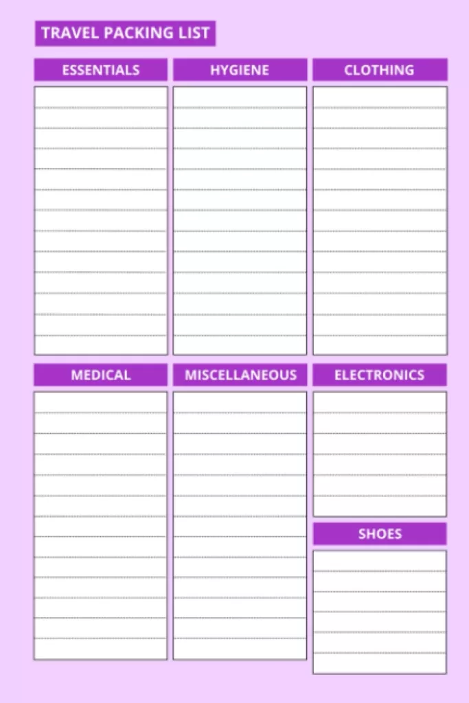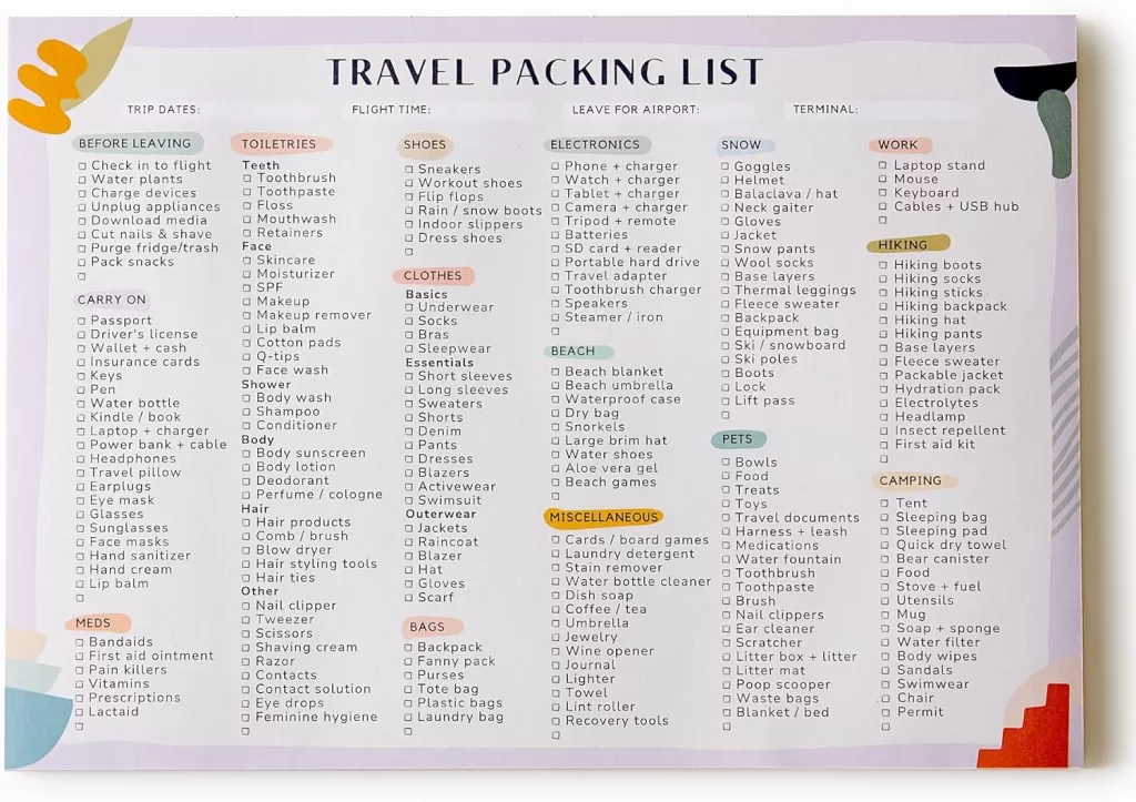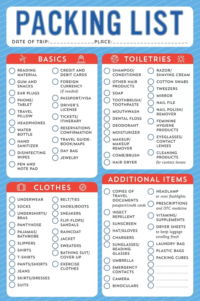 Focuses on what to pack. These checklists help ensure you don’t forget anything and are tailored to your specific destination or activity. Common packing list items include: